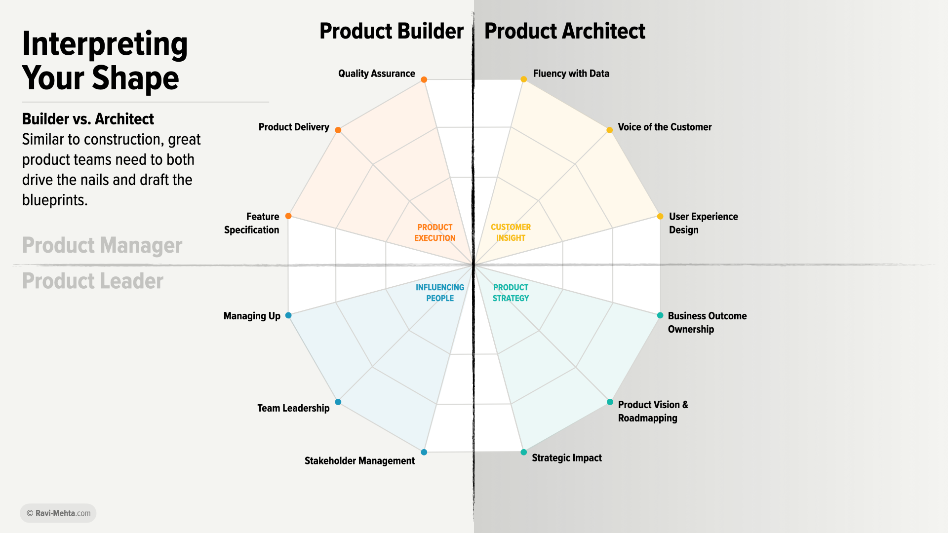 The shape helps PMs better understand their skills and where there are gaps across four areas: product execution (the ability to build exceptional products), customer insight (the ability to understand and deliver on customer needs), product strategy (the ability to drive business impact via product innovation), and influencing people (the ability to rally people around the team’s work).